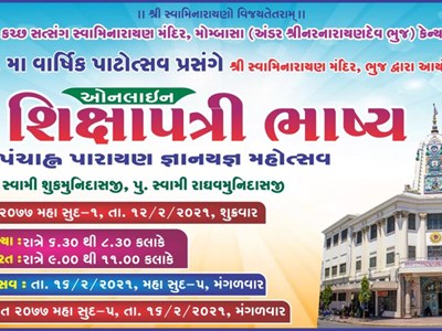 Shree Swaminarayan Temple Mombasa, Kenya will be celebrating it's 61st Patotsav from Friday 12th February to Tuesday 16th February 2021. Katha will be narrated by Bhuj Santo who will be reciting the Shikshapatri Bhashya katha from Bhuj.